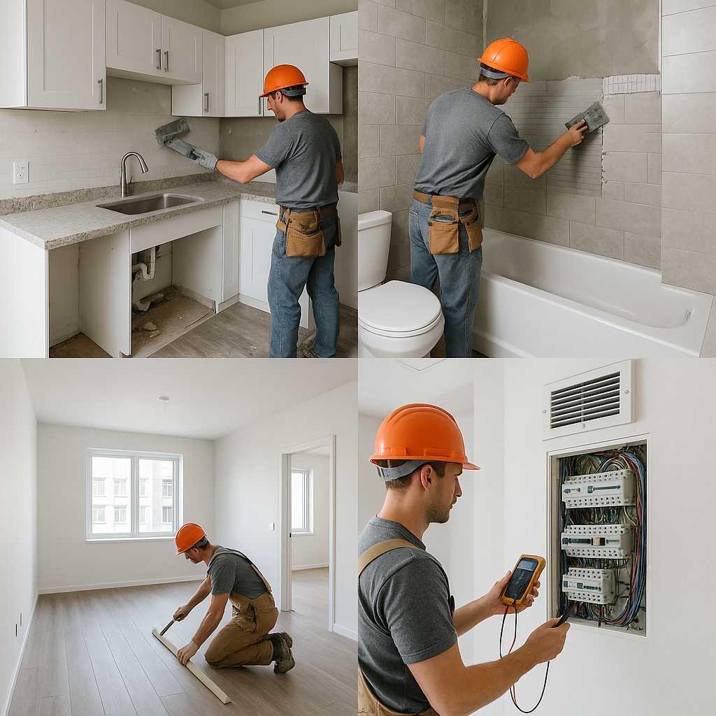 ترميم شامل لشقة: مطبخ، حمامات، غرف، فتحات تكييف، وفحص كهربائي
