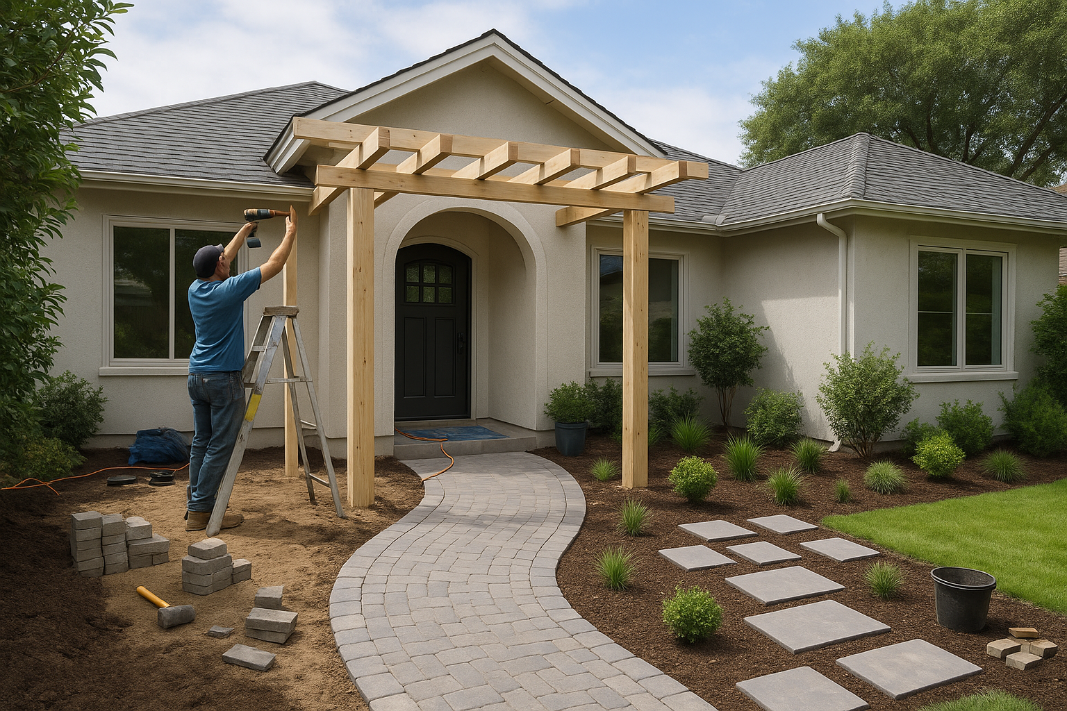 تنفيذ مشروع تجديد ديكورات المدخل الخارجي والحديقة الأمامية والداخلية