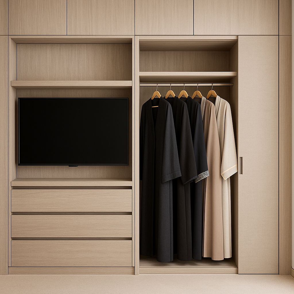مشروع ديكور مخصص في المنطقة الوسطى لتصميم خزانة عبايات فاخرة تتكامل مع ديكور شاشة التلفزيون. يتضمن التصميم أرففاً أنيقة وعصرية، وأدراج تخزين عملية، في تناغم مثالي بين الأناقة والوظيفة ليناسب ذوق العميل وتوقعاته.